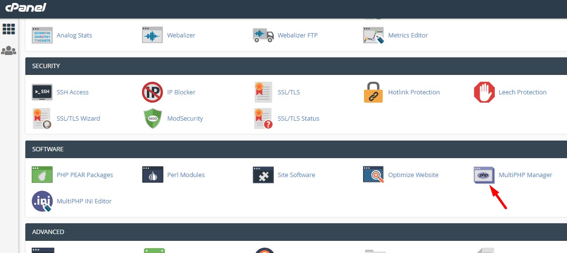 Log in to your cPanel and go to Software => MultiPHP Manager